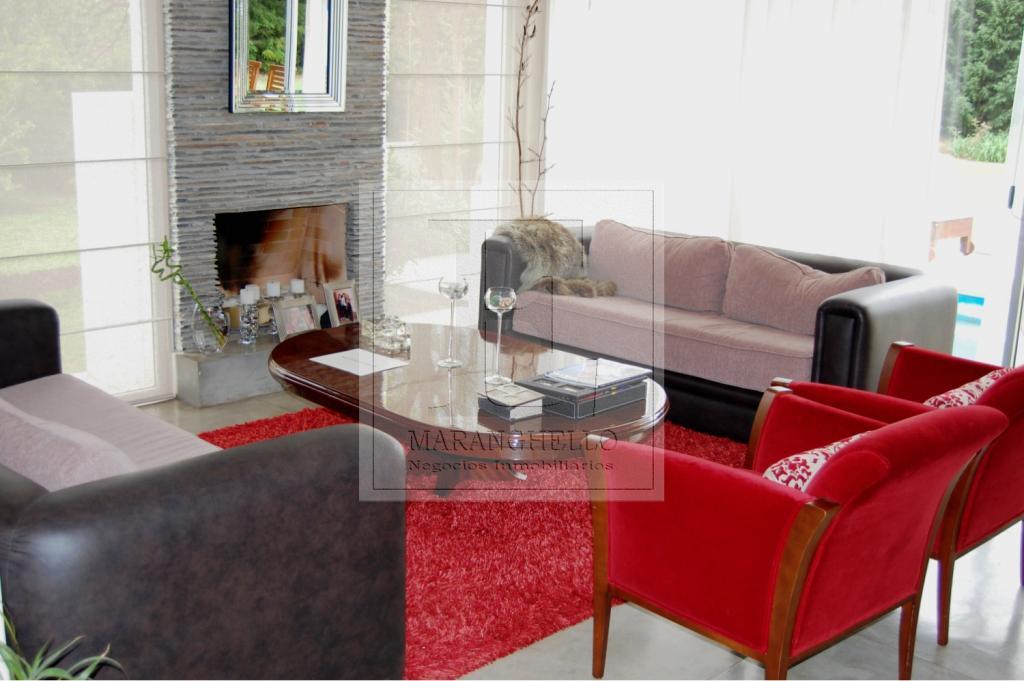 Ayres del Pilar. Casa de estilo racionalista en excelente ubicación con orientación noreste. Desarrollada en 2 plantas. Cuenta con hall de entrada en doble altura, toilette para visitas y escritorio. Living comedor con chimenea. Desde el comedor se accede a la cocina, la que cuenta con barra separadora del comedor diario; muy bien equipada. Habitación de servicio con baño, lavadero cubierto y sala de máquinas. En la planta alta se encuentra la habitación principal con baño en suite, vestidor y placares; muy cómoda. Otra de las habitaciones cuenta con baño en suite y balcón al frente. Completan la planta, un importante playroom y dos habitaciones de muy buen tamaño con vista al jardín y un baño completo. En el exterior, galería con parrilla y pileta en L. Muy buena parquización.